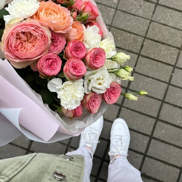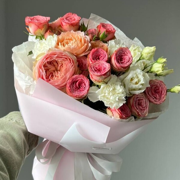 Состав: роза пионовидная одноголовая, роза кустовая пионовидная, эустома, гвоздика, авторская упаковка.