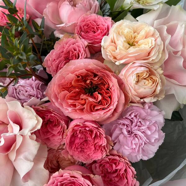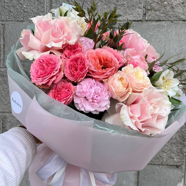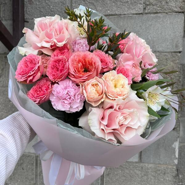 Состав: французская роза, кустовая пионовидная роза, гвоздика, альстромерия, эвкалипт.