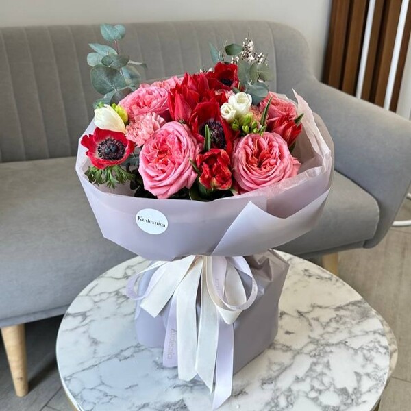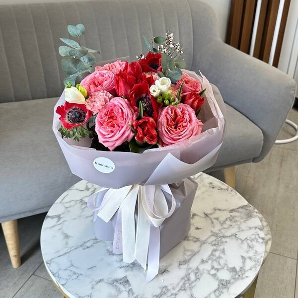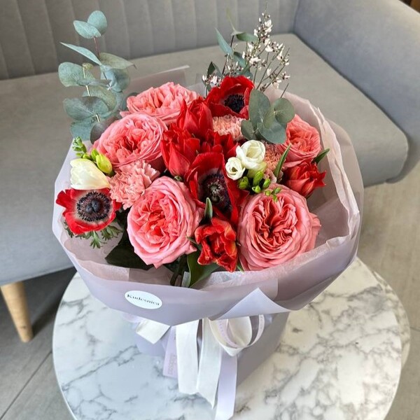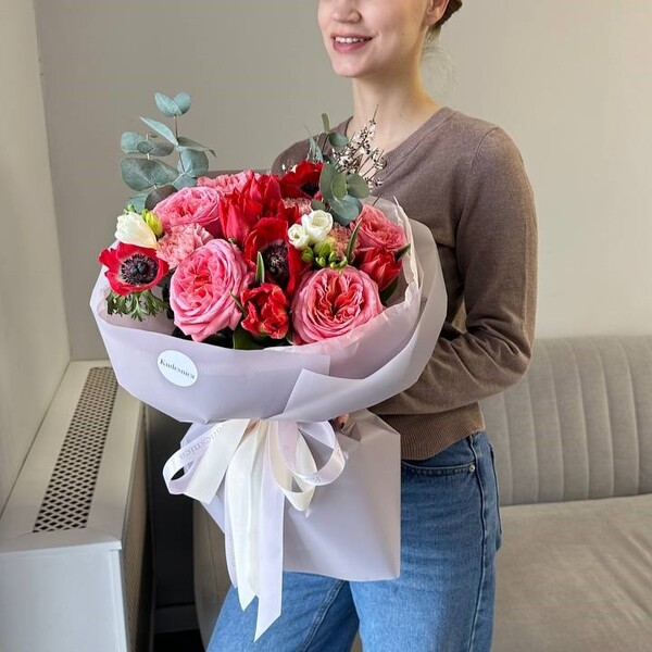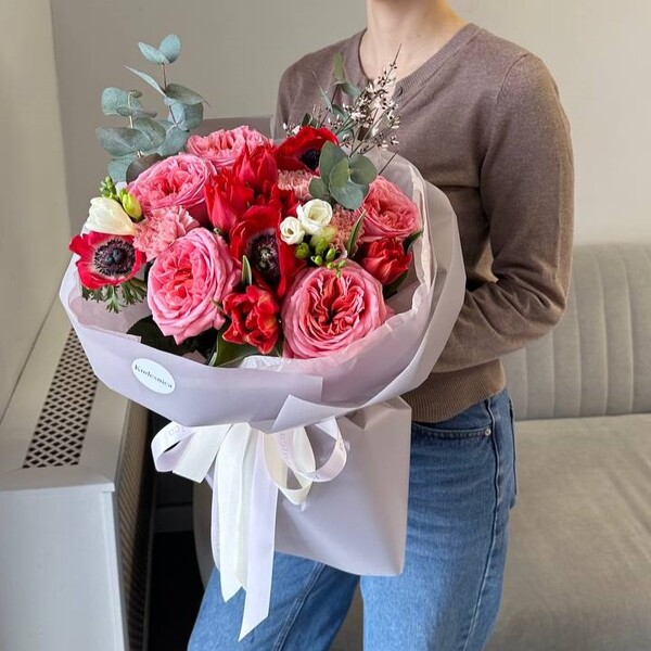 Состав: тюльпан пионовидный, анемон, роза одноголовая пионовидная, фрезия,гвоздика, гениста, эвкалипт.