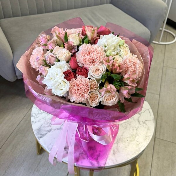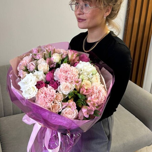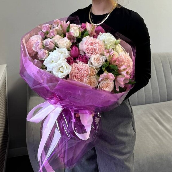 Состав: роза кустовая пионовидная, эустома, гвоздика, альстромерия, авторская упаковка.