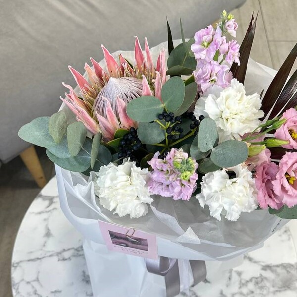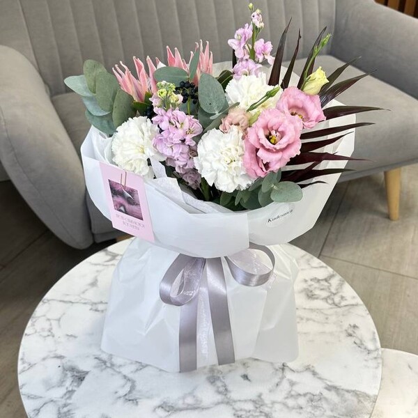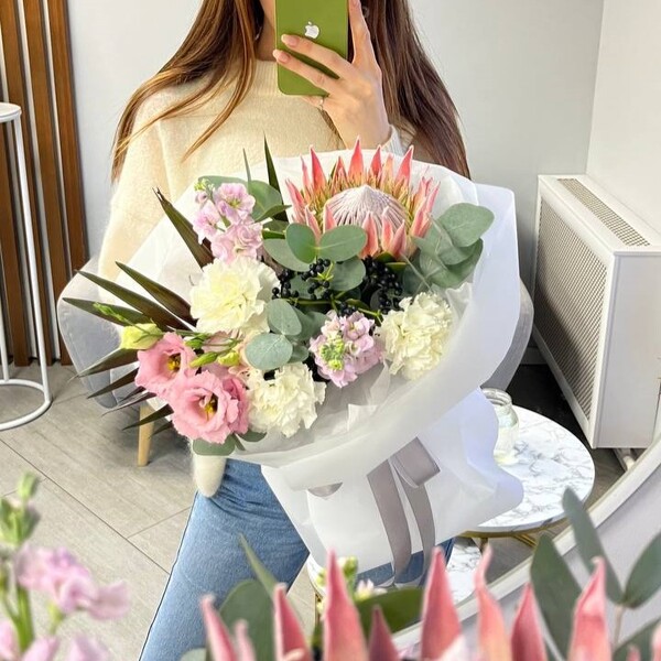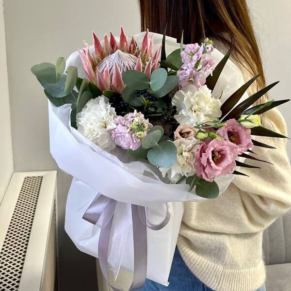 Состав: протея, матиолла, эустома, эвкалипт, чика, гвоздика, авторская упаковка.