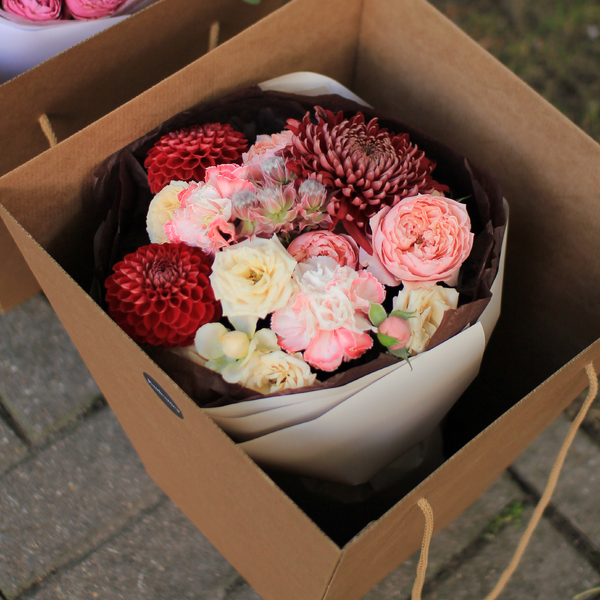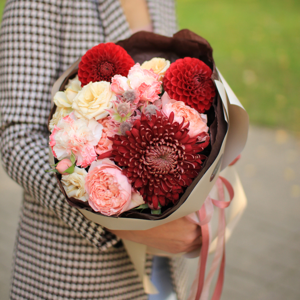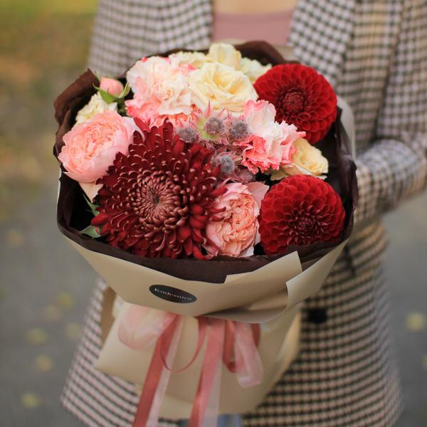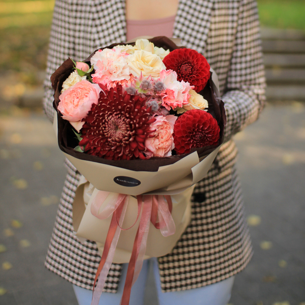 Состав: кустовые пионовидные розы, хризантема, гвоздика, георгин, серрурия, авторская упаковка