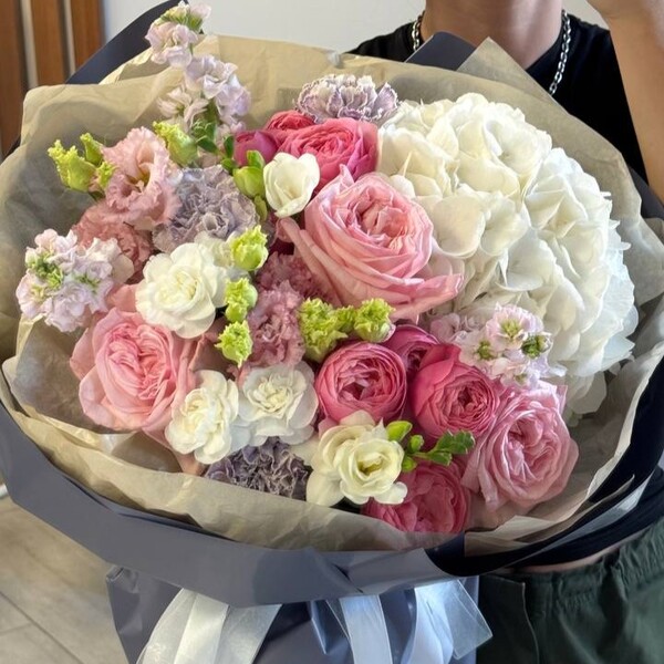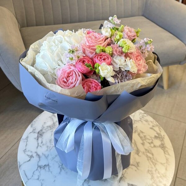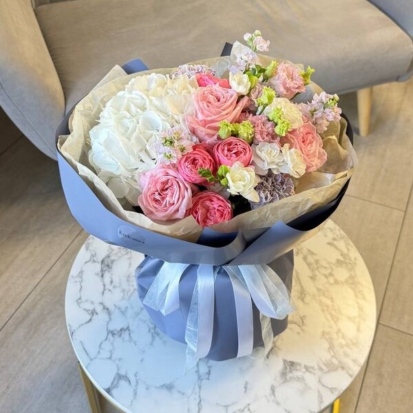 Состав: гортензия, роза одноголовая пионовидная, эустома, гвоздика крашеная, маттиолла, фрезия, авторская упаковка.