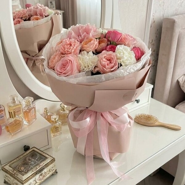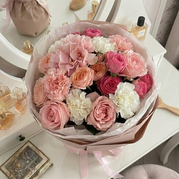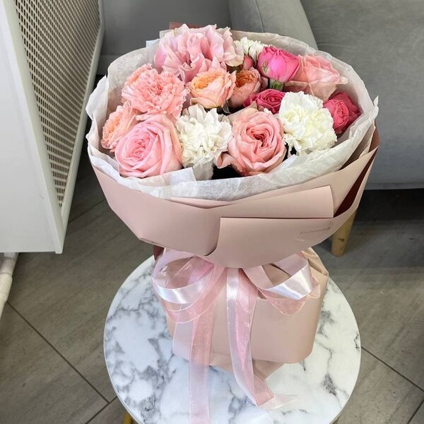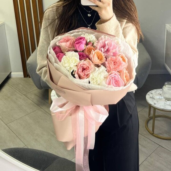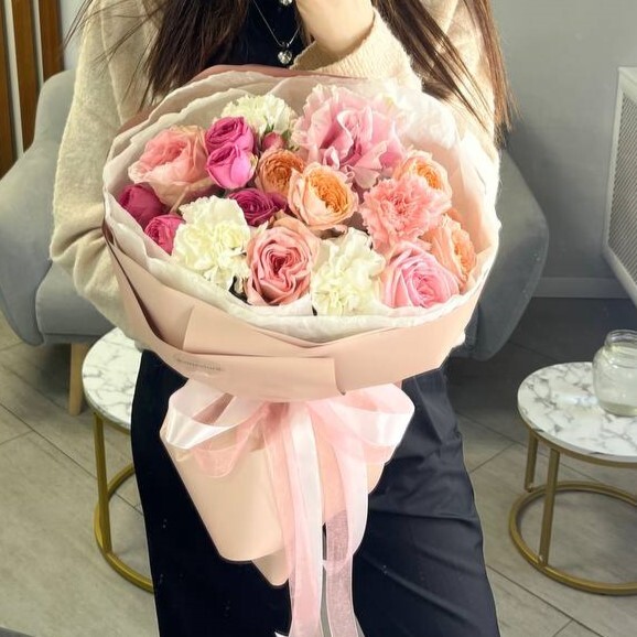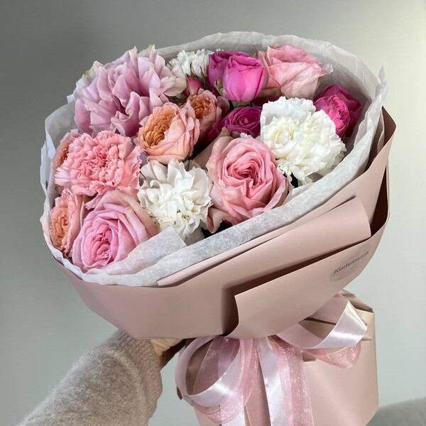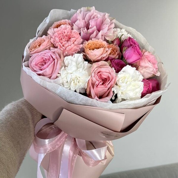 Состав: французская роза, роза, гвоздики, пионовидная кустовая роза, авторская упаковка.