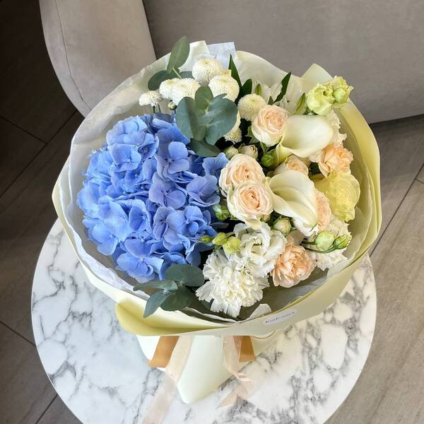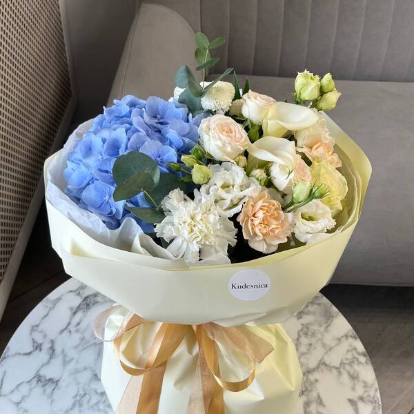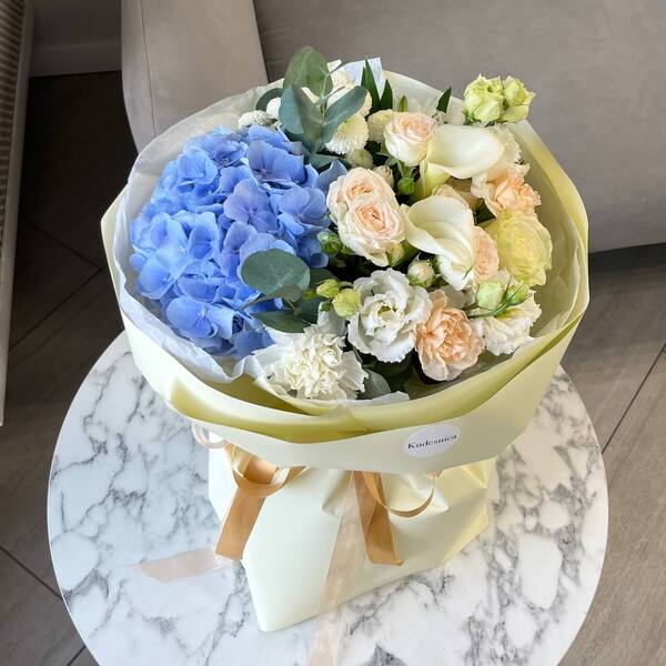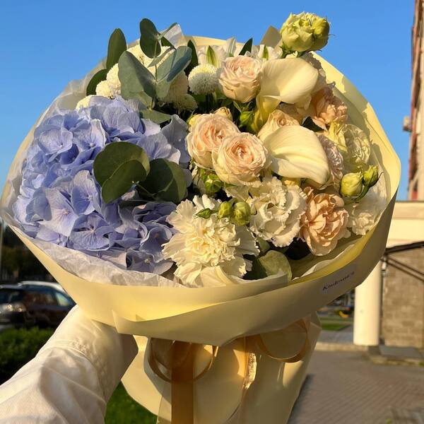 Состав: гортензия, гвоздика, кустовая роза, эустома, калла, эвкалипт.