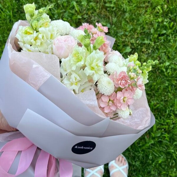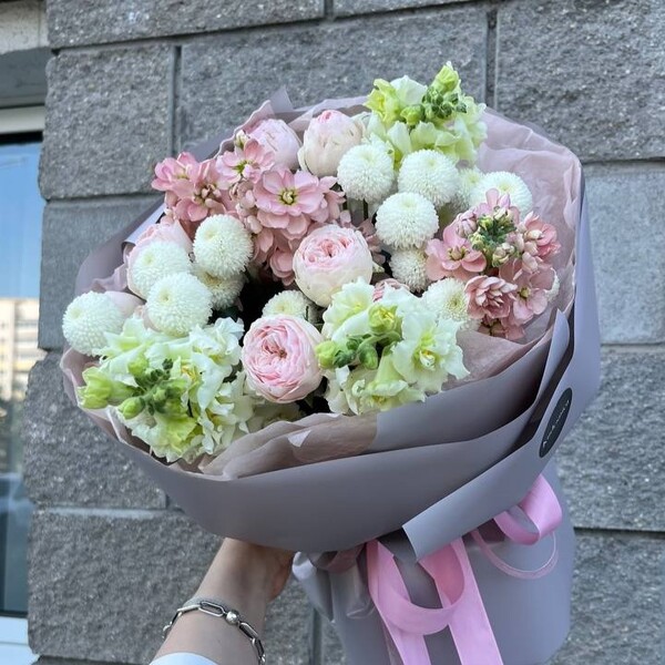 Состав: хризантема, маттиола, кустовая пионовидная роза, антириум, авторская упаковка.