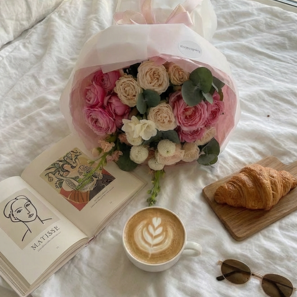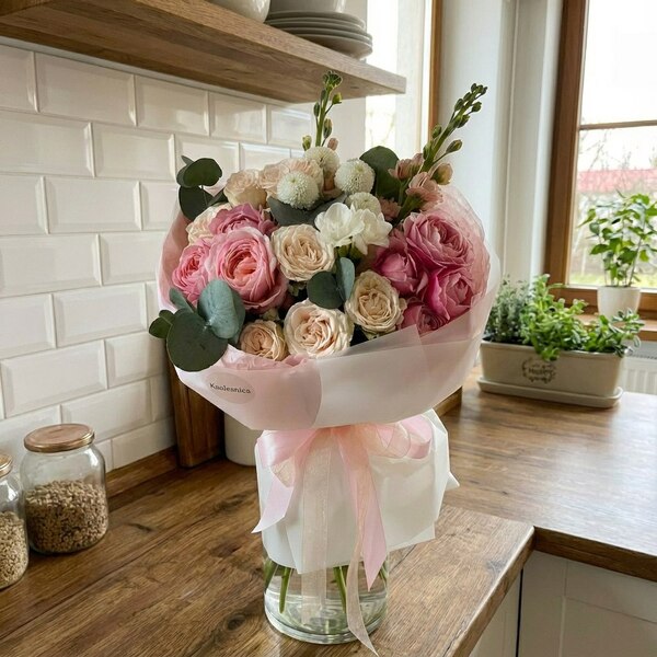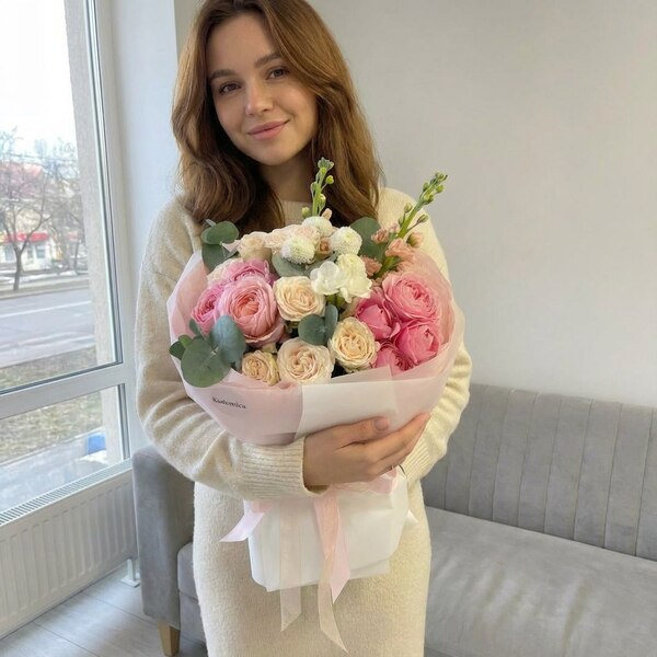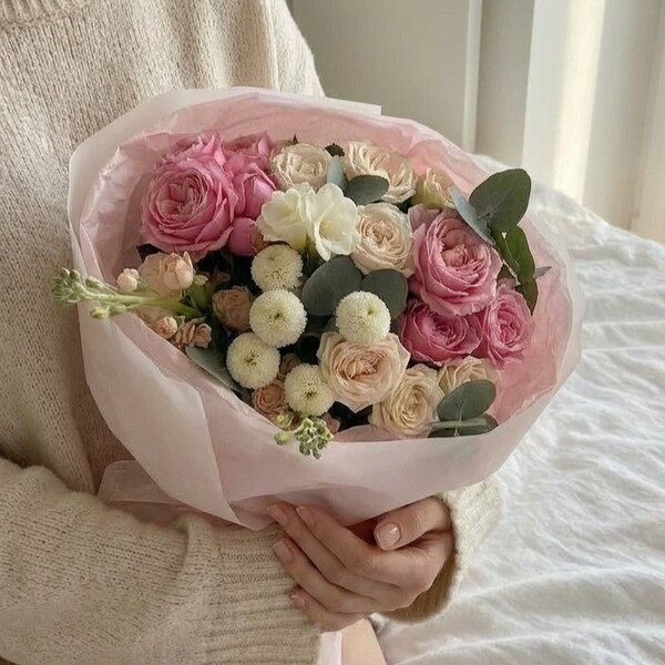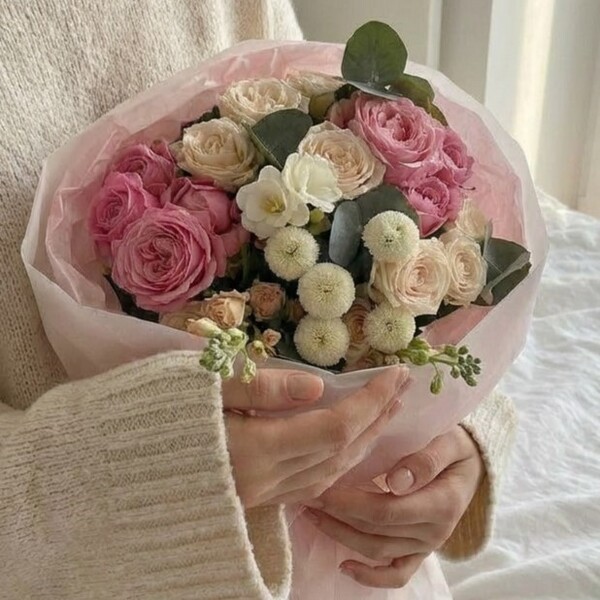 Состав: роза кустовая пионовидная, роза кустовая, фрезия, хризантема кустовая, маттиолла, эвкалипт, авторская упаковка.
