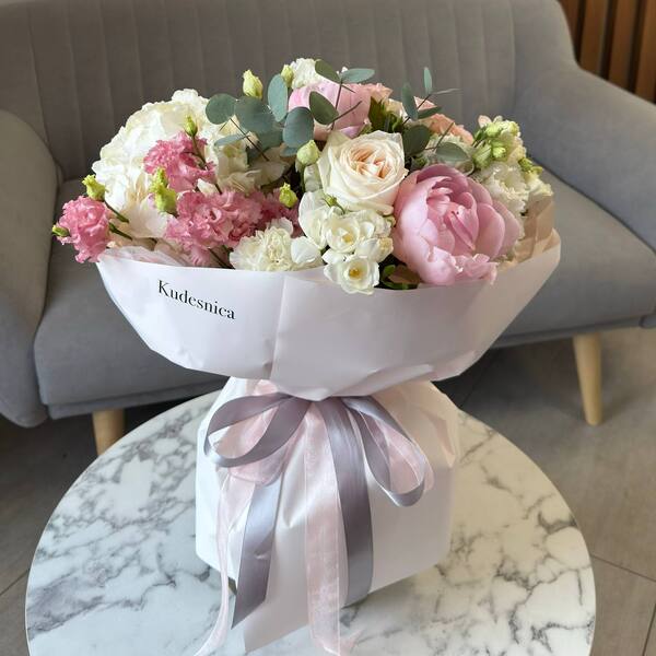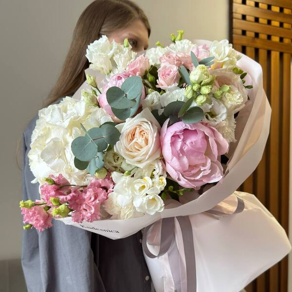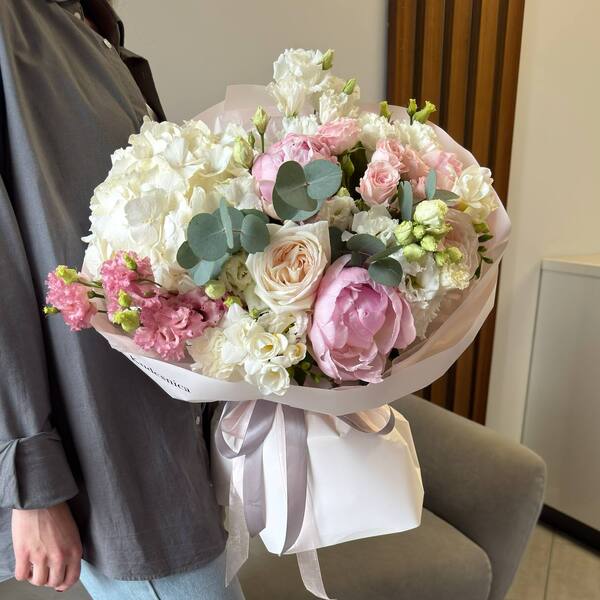 Состав: пион, гортензия, роза одноголовая пионовидная, эустома, роза кустовая пионовидная, фрезия, атворская упаковка.