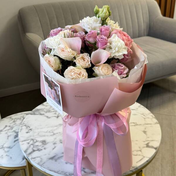 Состав: кустовая пионовидная роза, калла, эустома, пионовидная одноголовая роза, гвоздика, авторская упаковка.