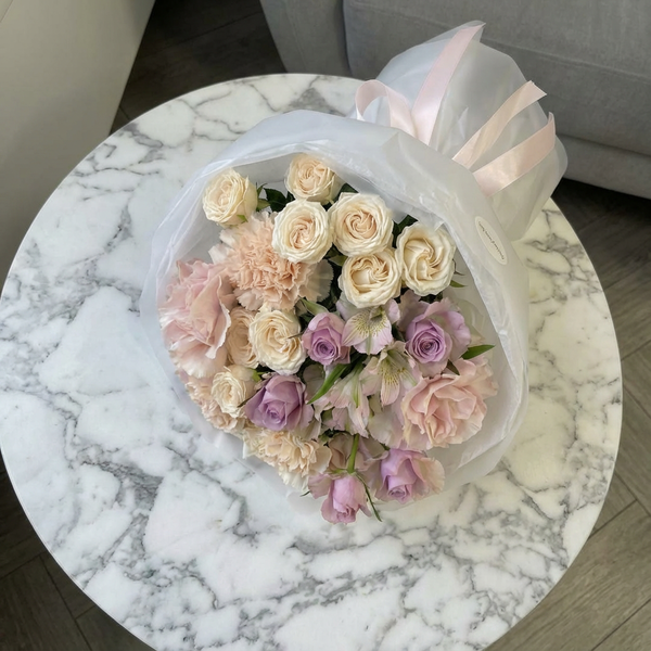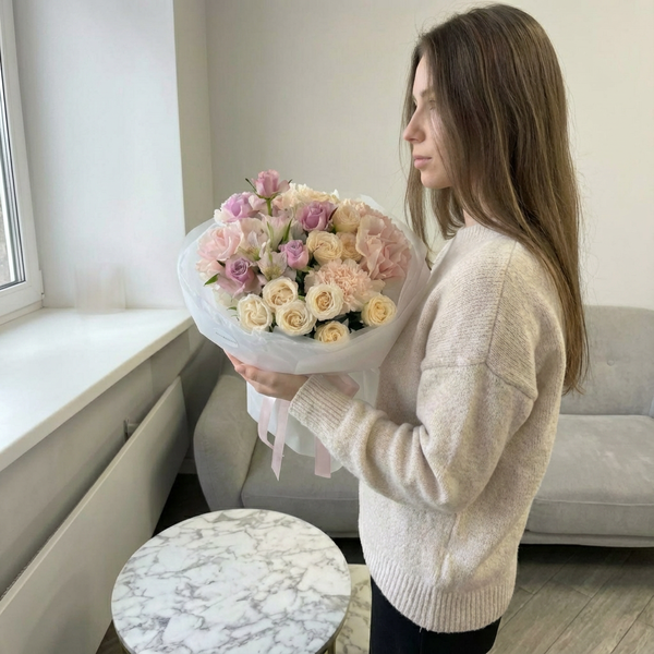 Состав: роза кустовая, роза французская, гвоздика, альстромерия, авторская упаковка.