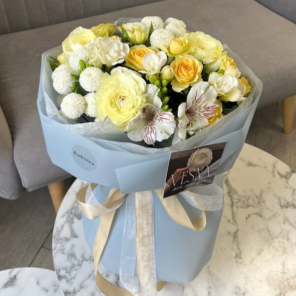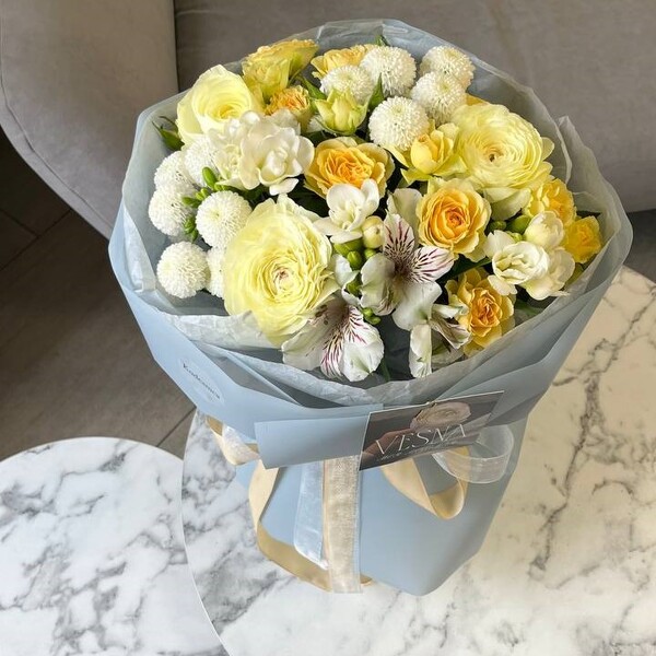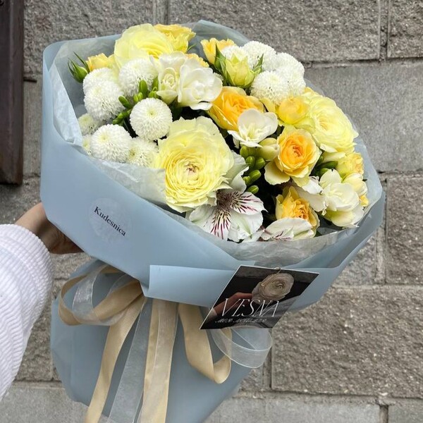 Состав: ранункулюс, фрезия, альстромерия, роза кустовая, хризантема кустовая, авторская упаковка.
