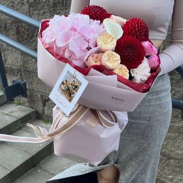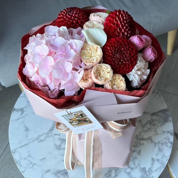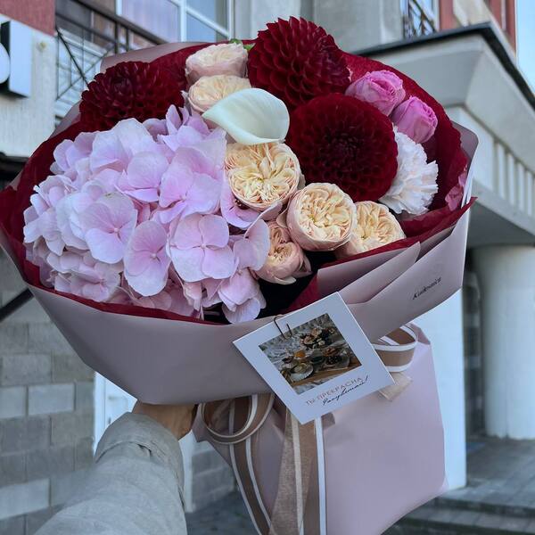Состав: гортензия, кустовая пионовидная роза, георгин, калла, гвоздика, авторская упаковка.