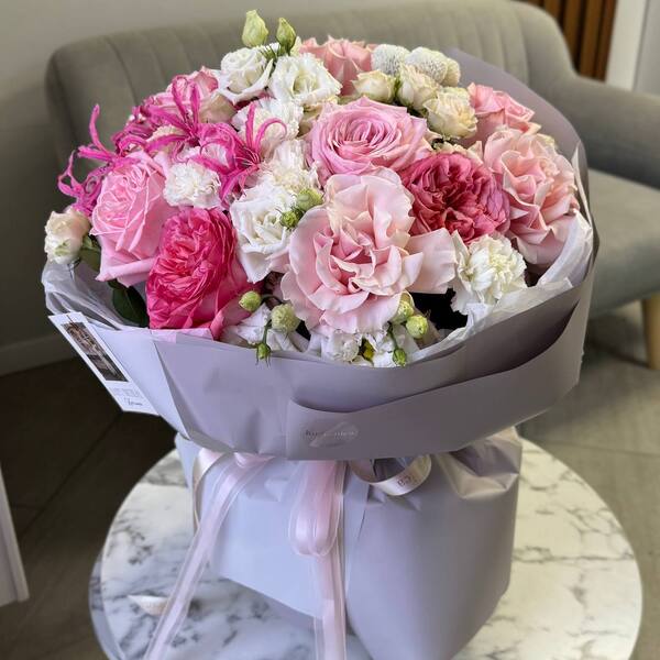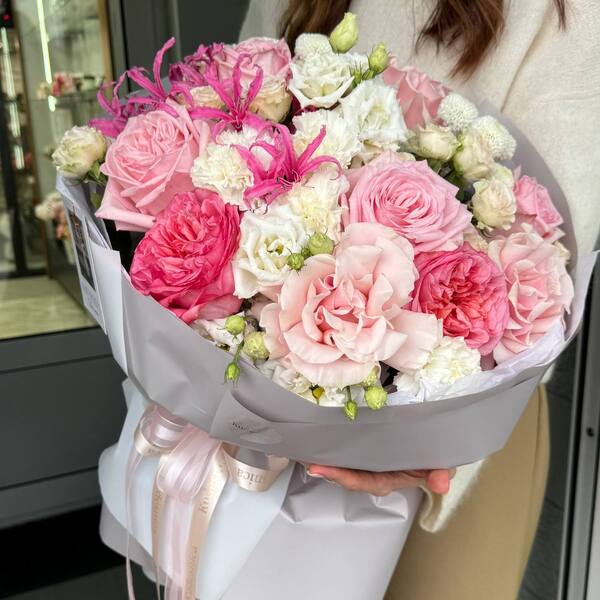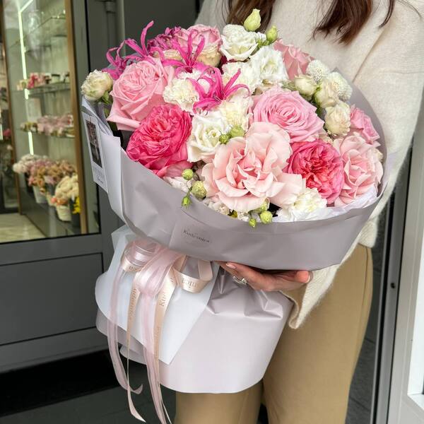 Состав: французская роза, пионовидная роза, эустома, кустовая пионовидная роза, хризантема, гвоздика, нерине, авторская упаковка.