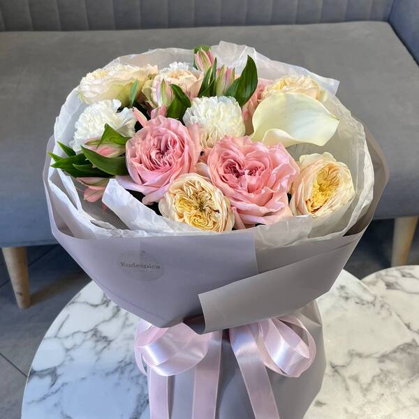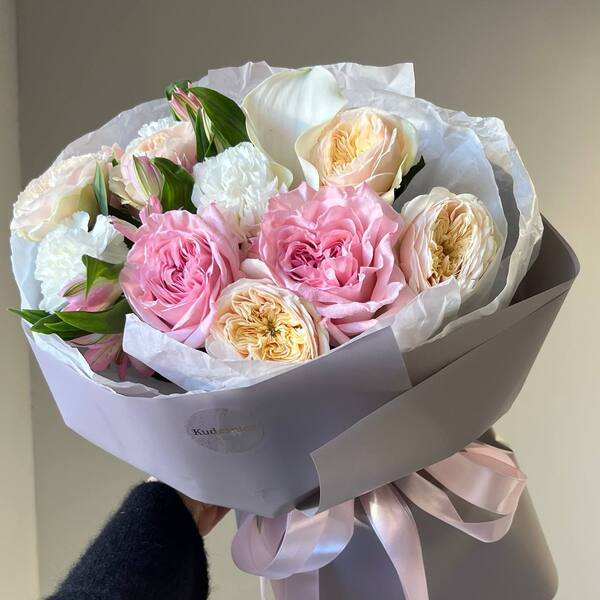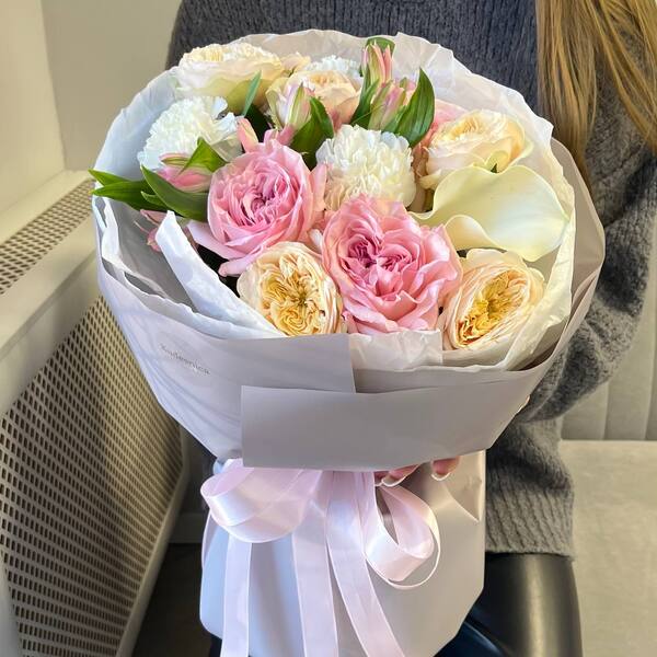 Состав: пионовиная кустовая роза, роза, альстромария, калла, гвоздика, авторская упаковка.