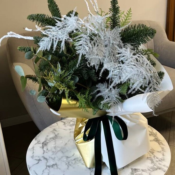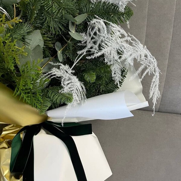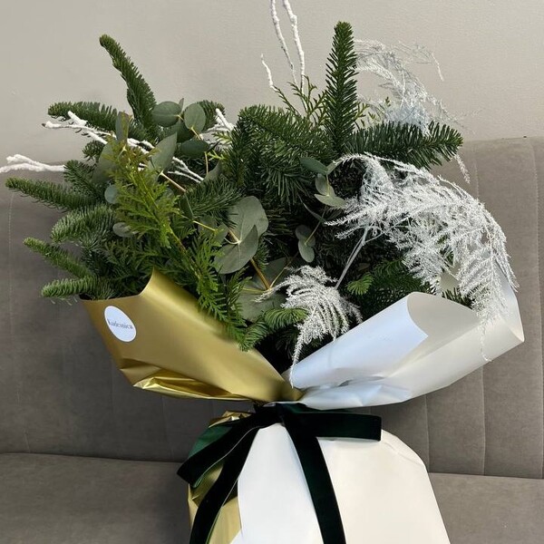 Состав: нобилис, эвкалипт, заснеженные ветки, аспарагус, авторская упаковка.