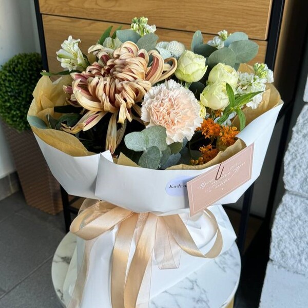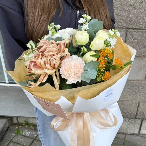 Состав: хризантема, маттиола, гвоздика, асклепия, кустовая пионовидная роза, альстромерия, авторская упаковка.