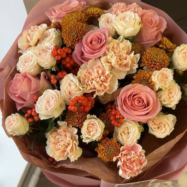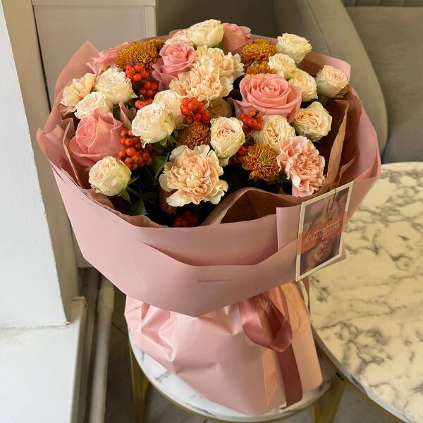 Состав: кустовая пионовидная роза, роза, гвоздика, хризантема, иллекс, авторская упаковка.