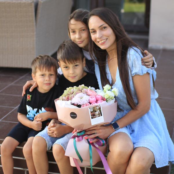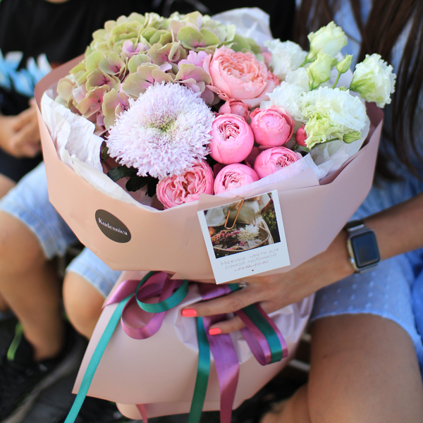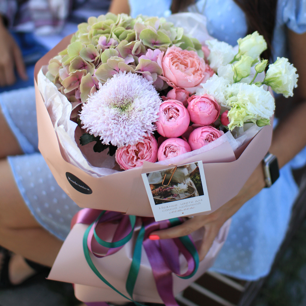 Состав: гортензия, кустовая пионовидная роза, хризантема, эустома, авторская упаковка.