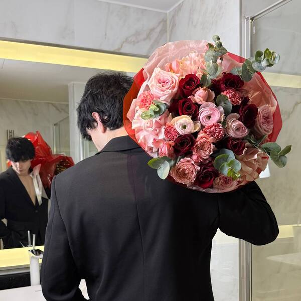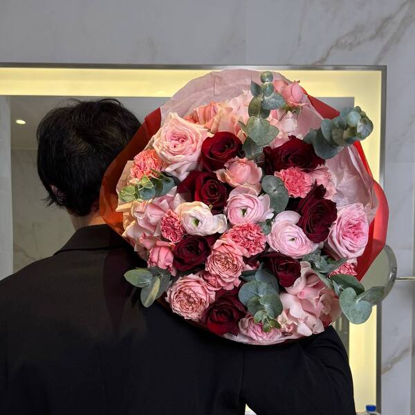Состав: ранункулюс, роза одноголовая, роза одноголовая пионовидная, роза кустовая пионовидная, гвоздика, роза французская, эвкалипт, авторская упаковка.