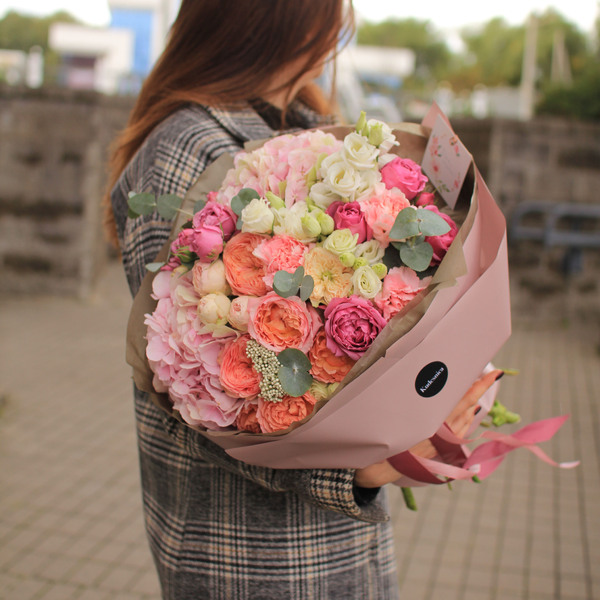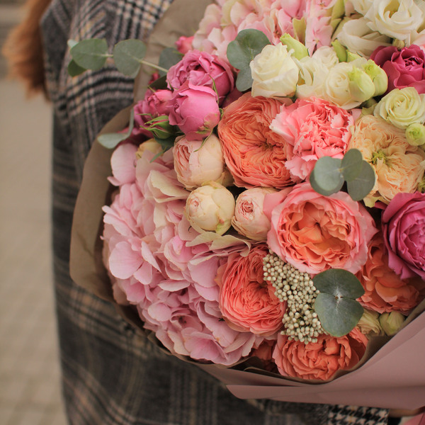 Состав: гортензия, роза пионовидная одноголовая, роза пионовидная кустовая, эустома, гвоздика, озотамнус, авторская упаковка.