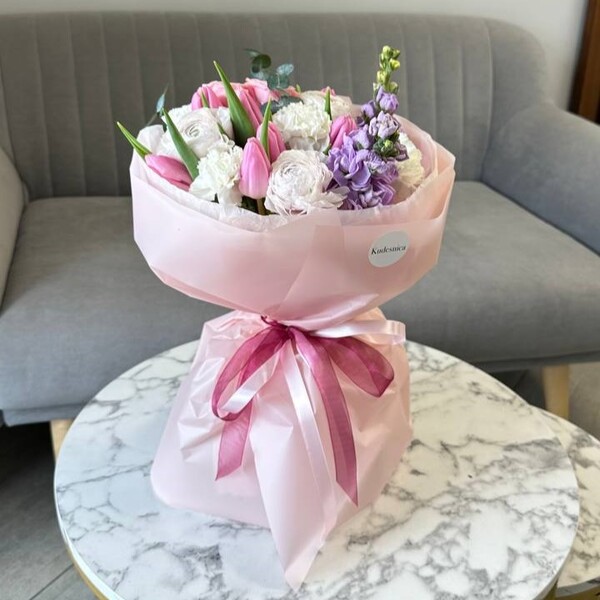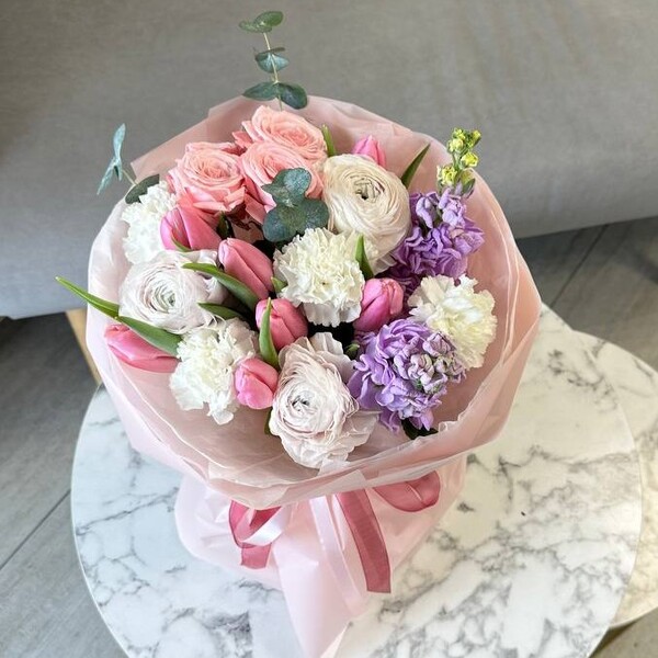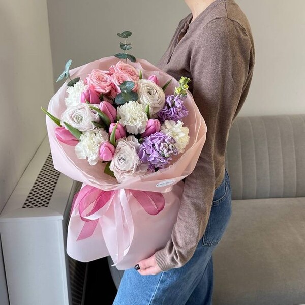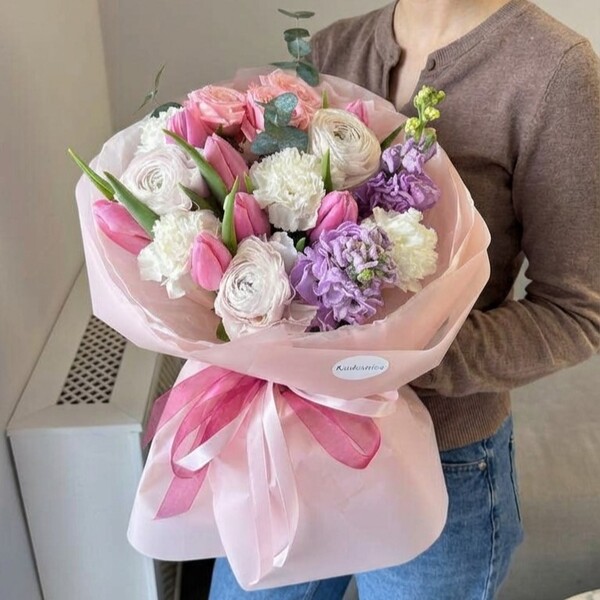 Состав: ранункулюс, тюльпан, роза кустовая пионовидная, матиолла, гвоздика, авторская упаковка.