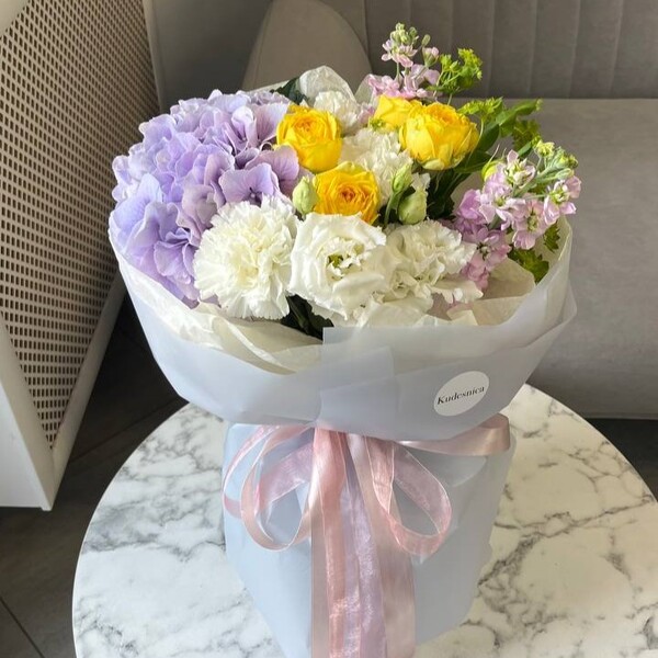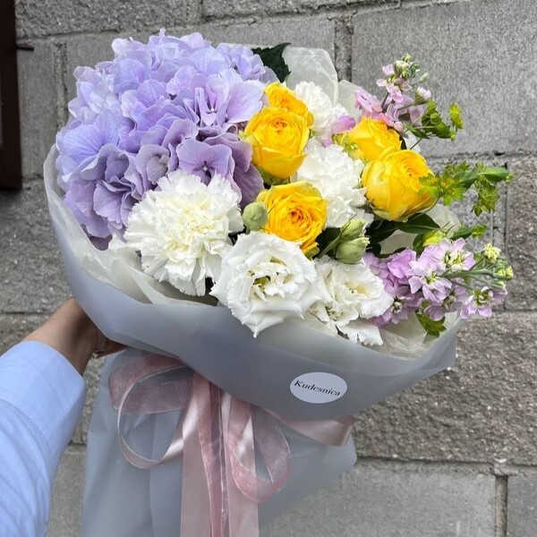 Состав: гортензия, роза кустовая пионовидная, эустома, матиолла, гвоздика, авторская упаковка.