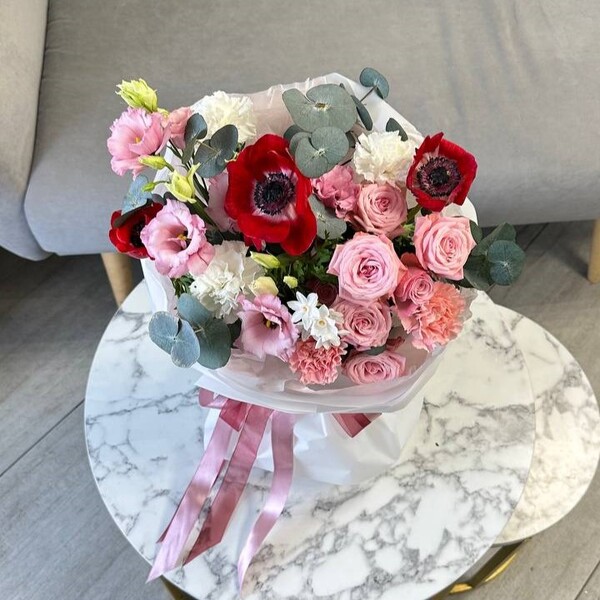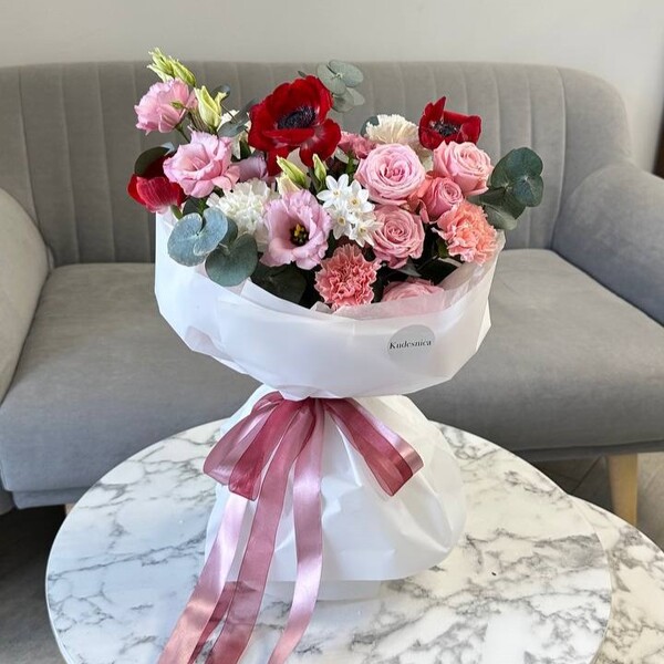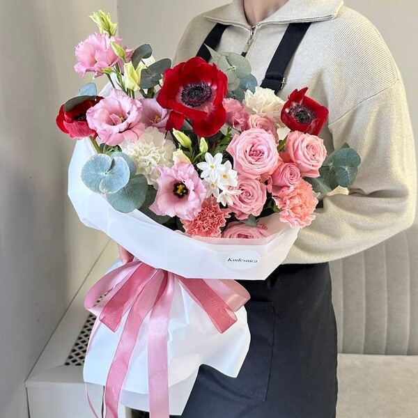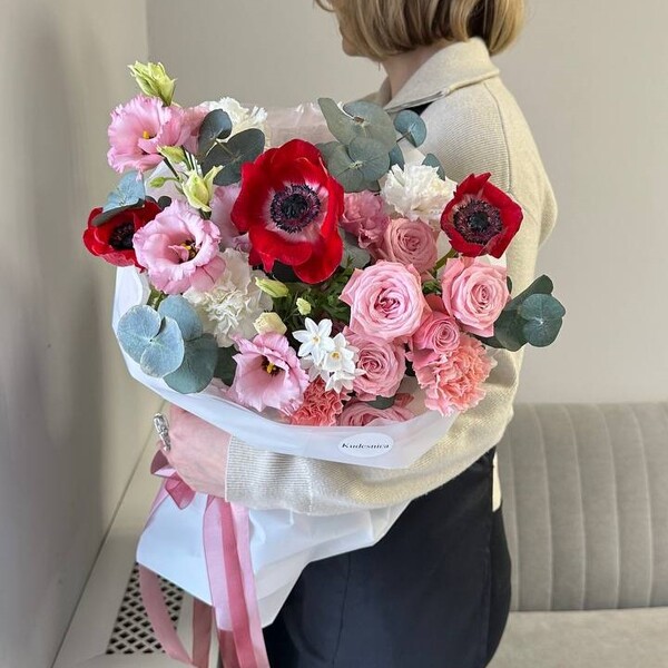 Состав: анемон, роза кустовая пионовидная, нарцисс, эустома, гвоздика, эвкалипт, авторская упаковка.