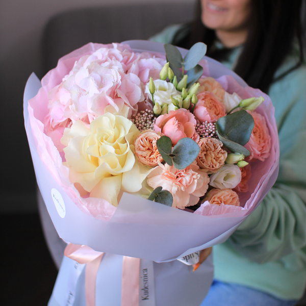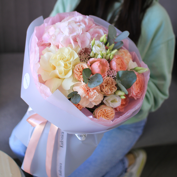 Состав: гортензия, французская роза, кустовая пионовидная роза, эустома,озотамнус, гвоздика, эвкалипт, авторская упаковка.
