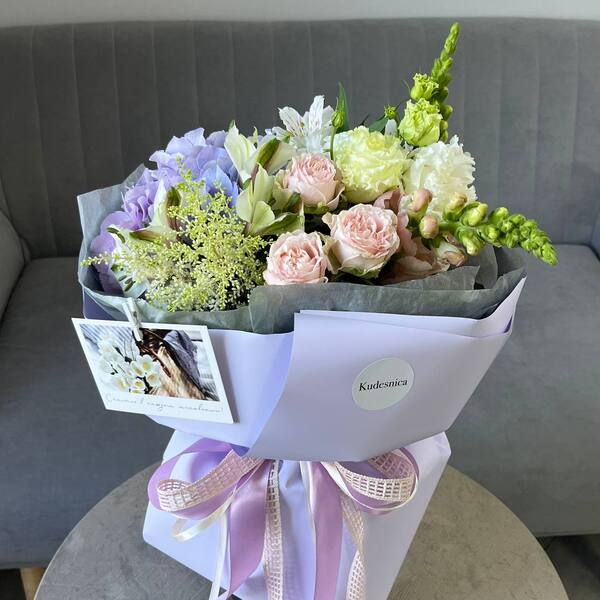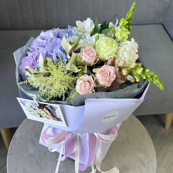 Состав: гортензия, кустовая роза, эустома, астильба, альстромерия, антиринум, авторская упаковка.