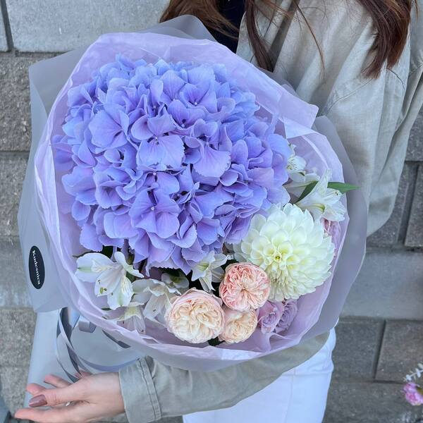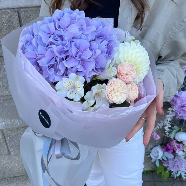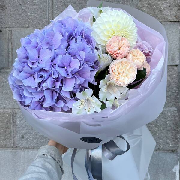 Состав: гортензия, кустовая пионовидная роза, альстромерия, георгин, авторская упаковка.