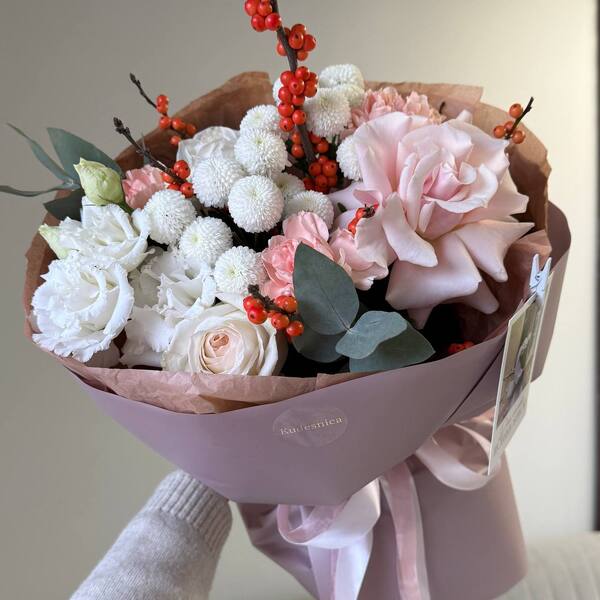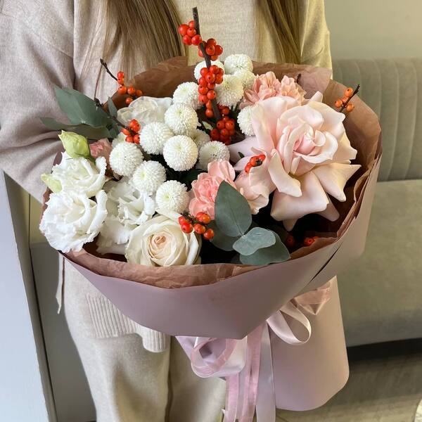 Состав: илекс, французская роза, хризантема, эустома, роза, гвоздика, авторская упаковка.