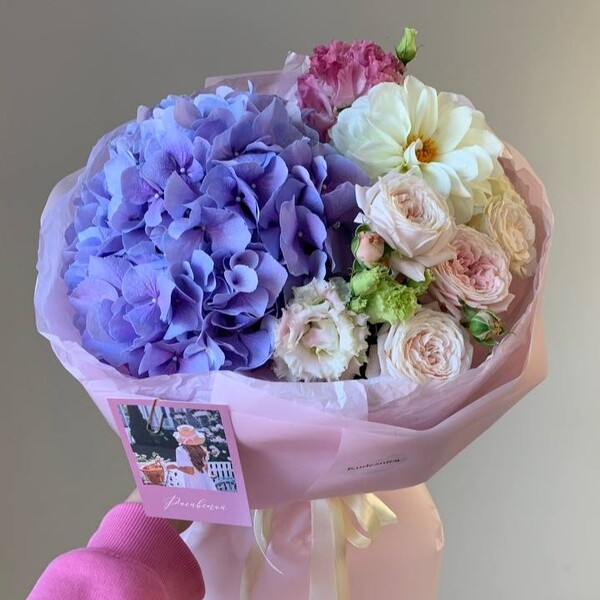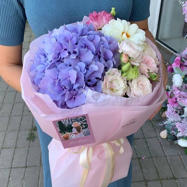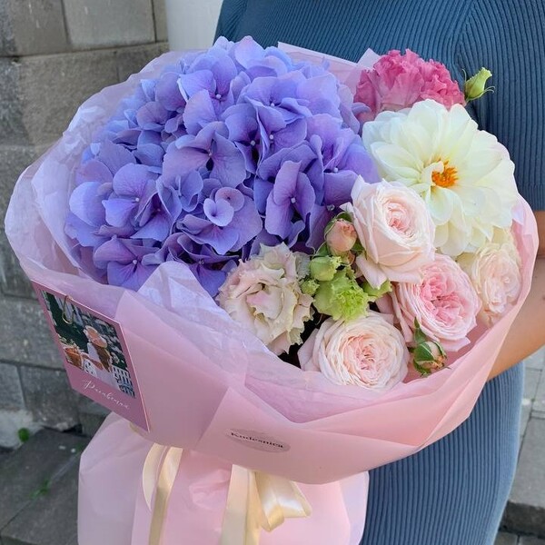 Состав: георгин, гортензия, кустовая пионовидная роза, эустома, авторская упаковка.