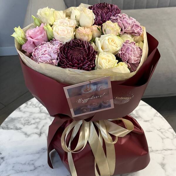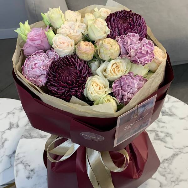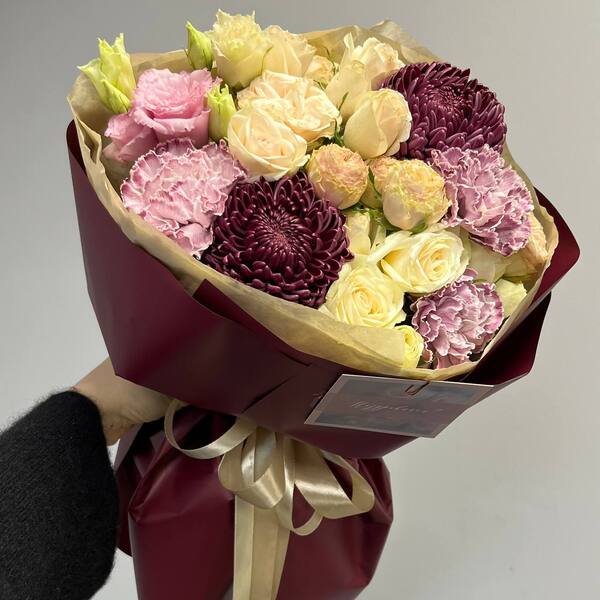 Состав: роза пионовидная кустовая, хризантема, гвоздика, эустома, авторская упаковка.