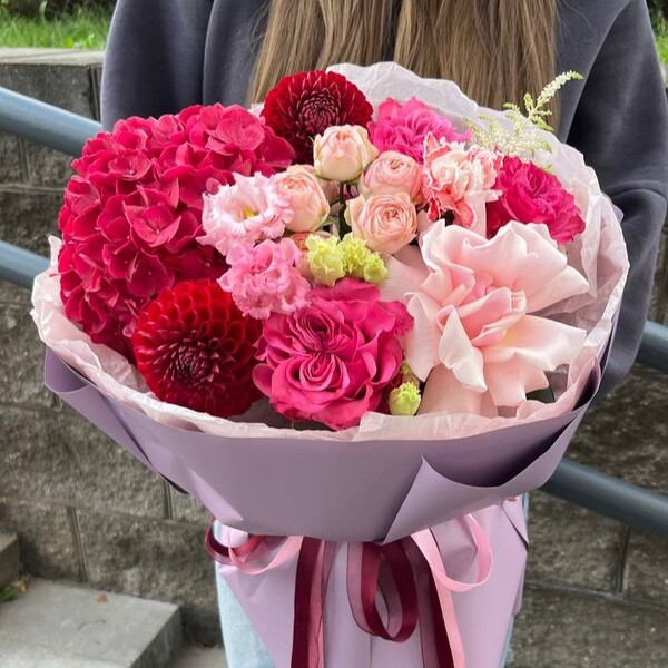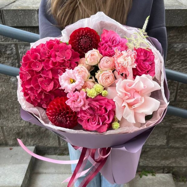 Состав: гортензия, одноголовая роза, эустома, гвоздика, французская роза, георгин, астильба, кустовая пионовидная роза, авторский букет.