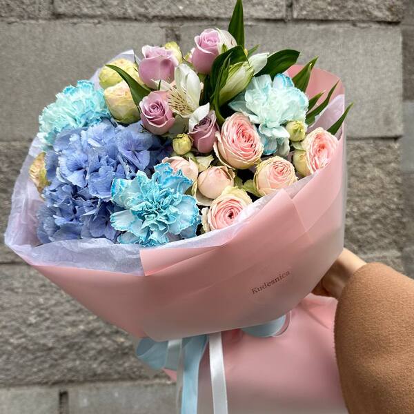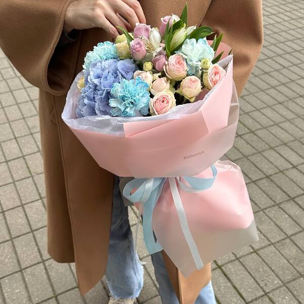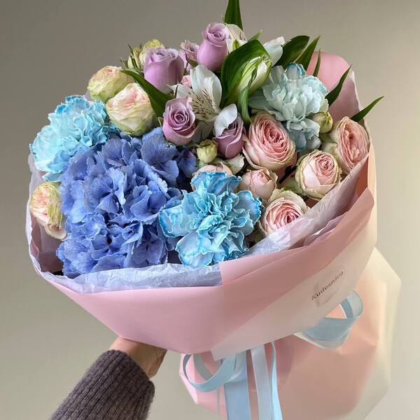 Состав: кустовая пионовидная роза, гвоздика, гортензия, альстромерия, авторская упаковка.