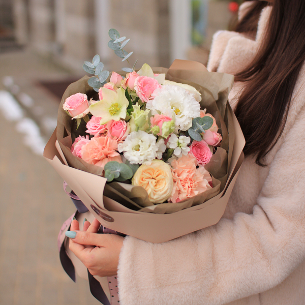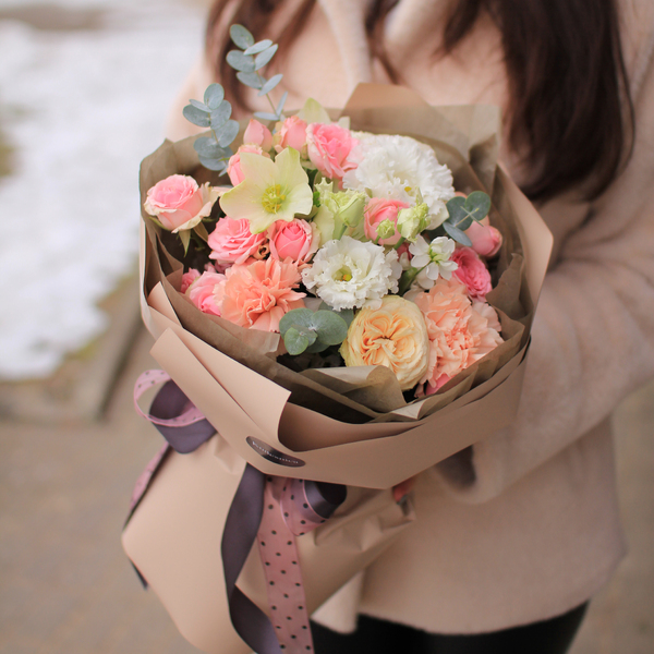Состав: эустома, кустовая пионовидная роза, матиолла, гвоздика, эвкалипт, австорская упаковка.