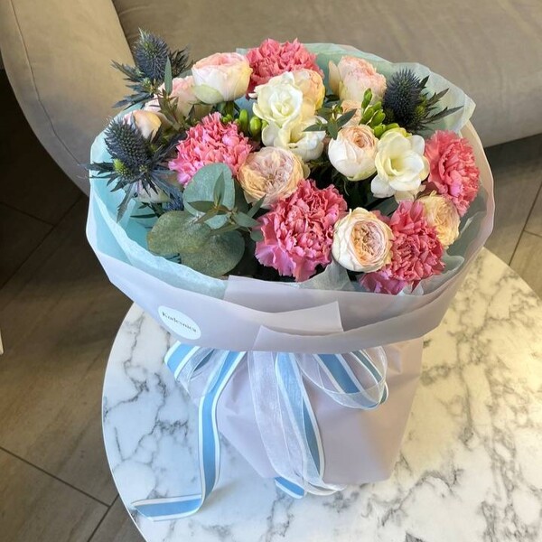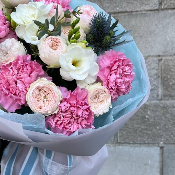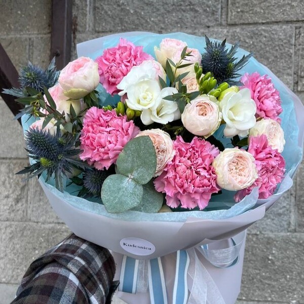 Состав: роза кустовая пионовидная, гвоздика, фрезия, эрингиум, эвкалипт, авторская упаковка.
