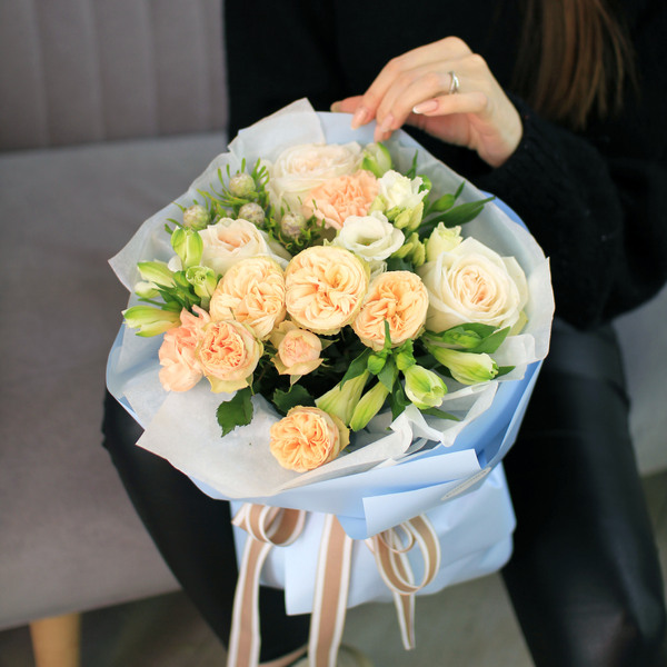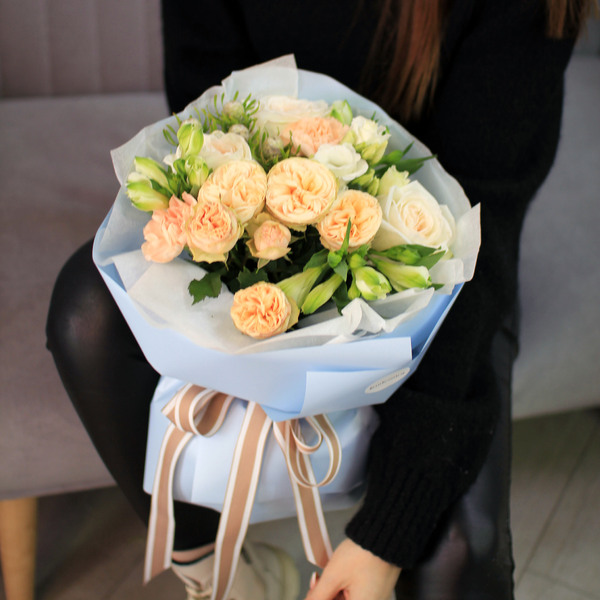 Состав: кустовая пионовидная роза, альстромерия, одноголовая пионовидная роза, шишки леукадендрона, гвоздика, авторская упаковка.