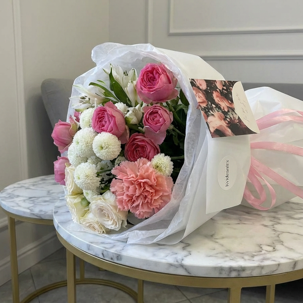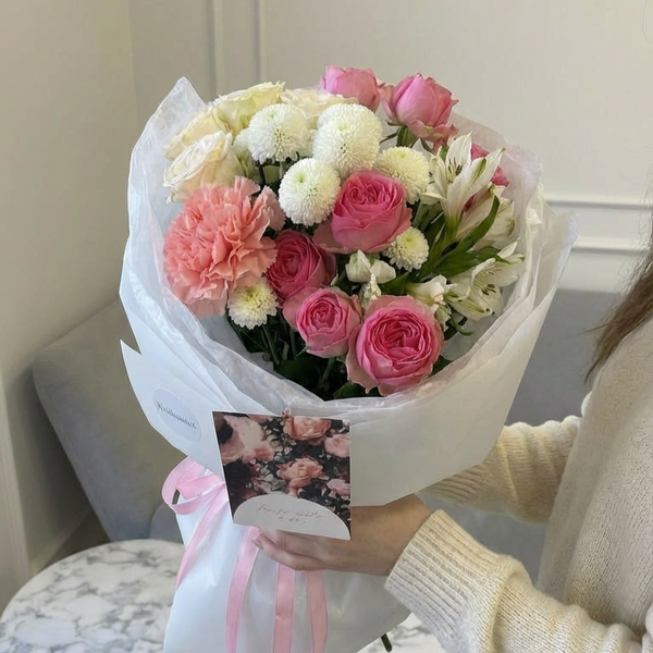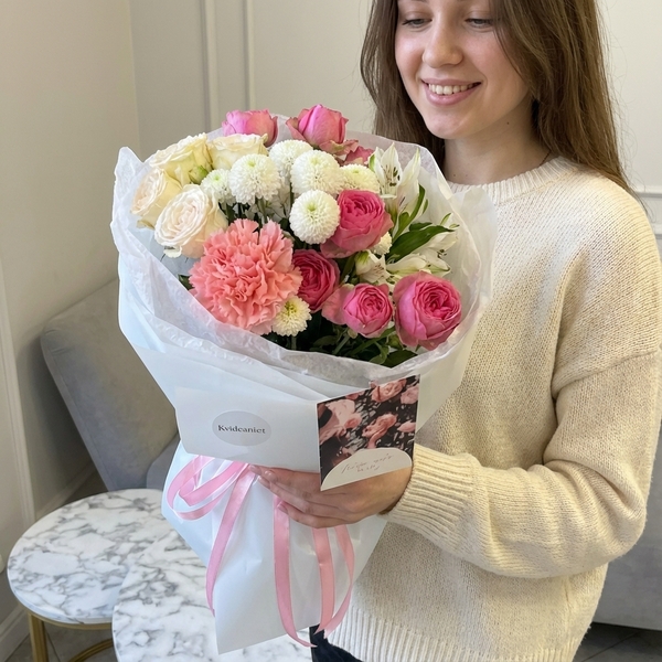 Состав: пионовидная кустовая роза, хризантема кустовая, альстромерия, гвоздика, авторская упаковка.