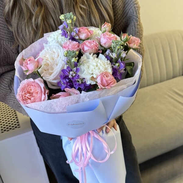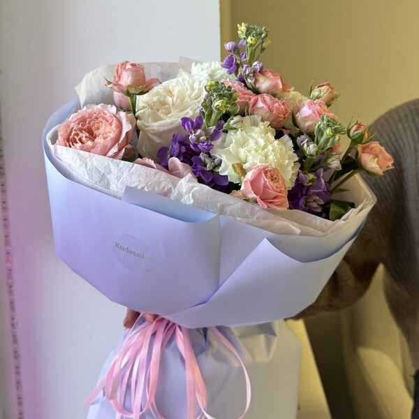 Состав: кустовая роза, маттиола, кустовая пионовидная роза, гвоздика, роза, авторская упаковка.