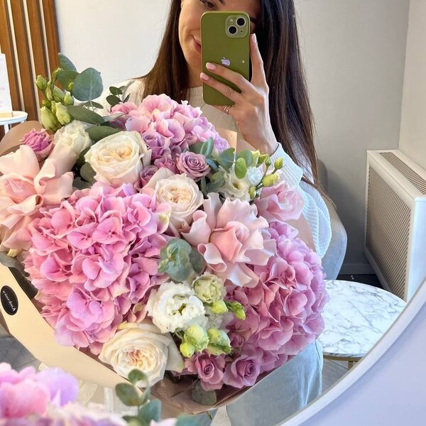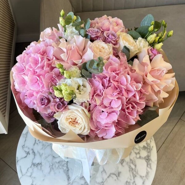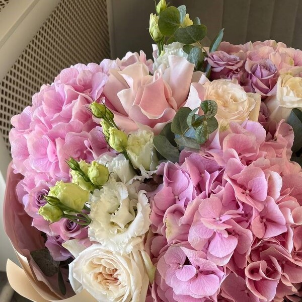 Состав: гортензия, роза пионовидная одноголовая, роза кустовая, роза французская, эустома, эвкалипт, авторская упаковка.