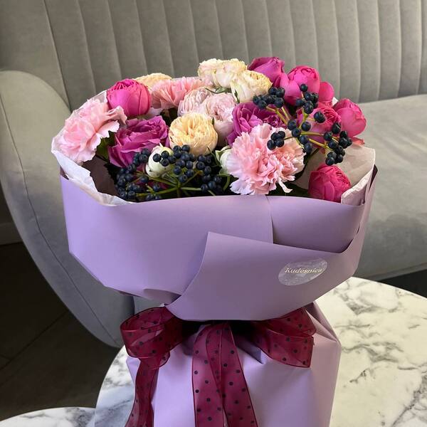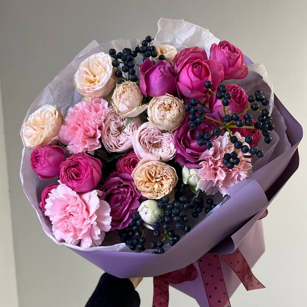 Состав: кустовая пионовидная роза, гвоздика, вибурнум, авторская упаковка.