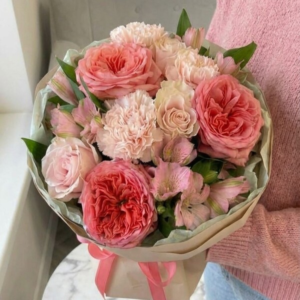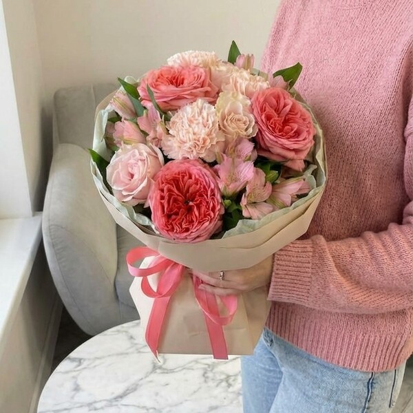 Состав: роза пионовидная одноголовая, роза кустовая, роза одноголовая, альстромерия, авторская упаковка.