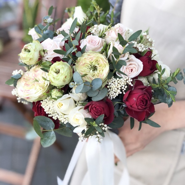 Цветы во всех букетах и композициях могут меняться от сезона. Мы всегда сохраняем цветовую гамму и объем букета. Состав: кустовые розы разных сортов, эвкалипт.