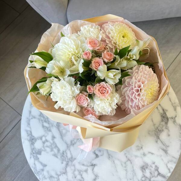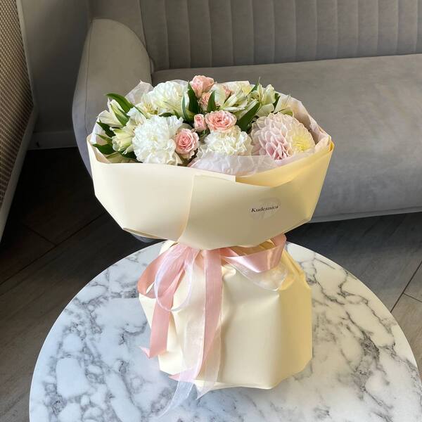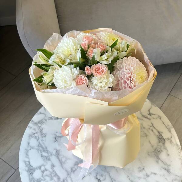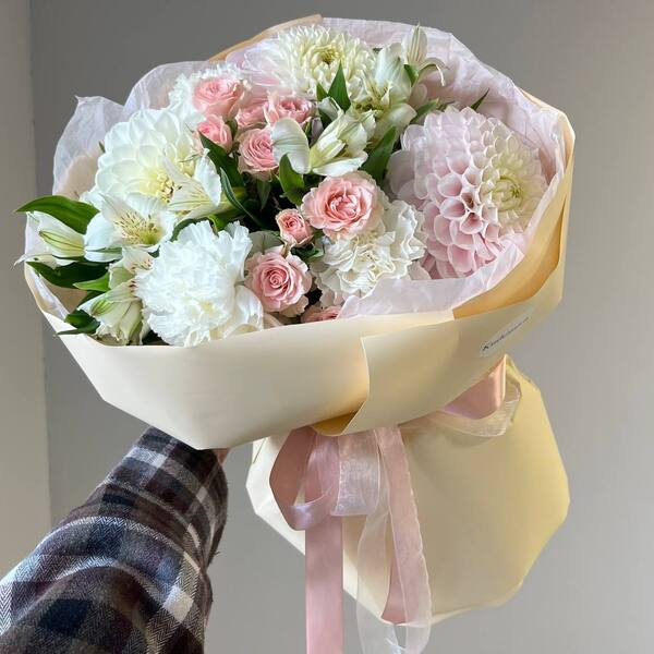 Состав: георгин, роза кустовая, альстромерия, гвоздика, авторская упаковка.