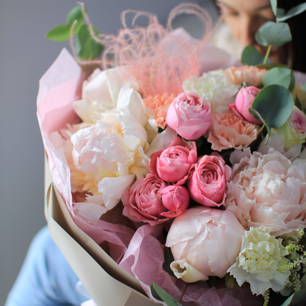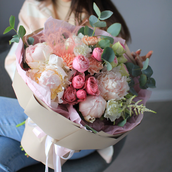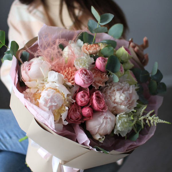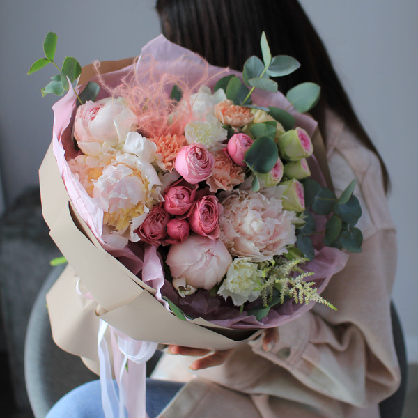 Состав букета: пион, пионовидная кустовая роза, стифа, астильба, гвоздика, авторская упаковка.