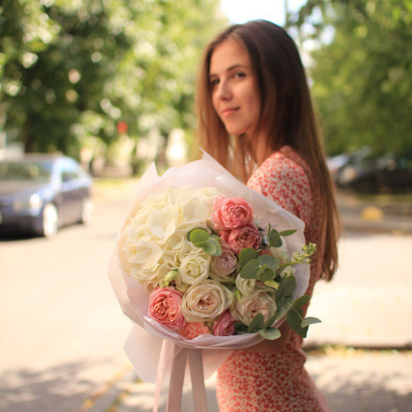 Состав: гортензия, кустовая пионовидная роза, эустома, маттиола, роза, авторская упаковка.
