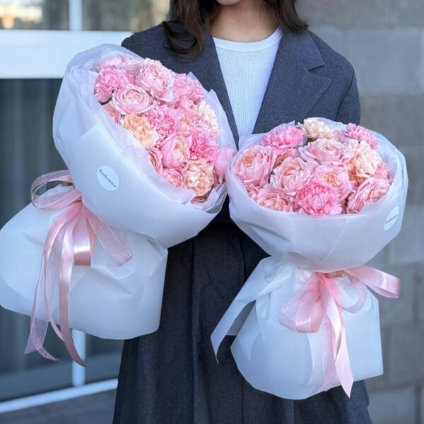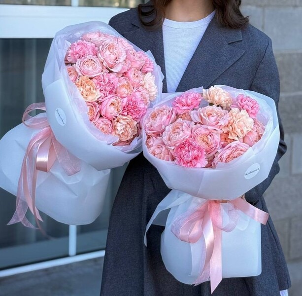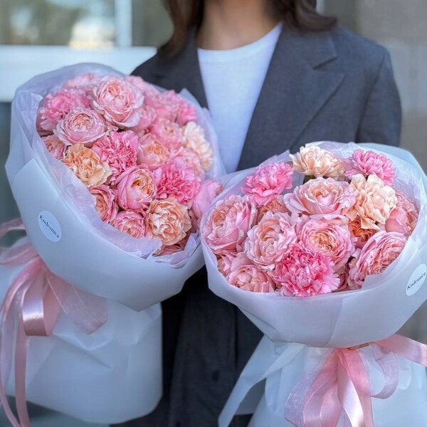 Состав: кустовая пионовидная роза, гвоздика, авторская упаковка.