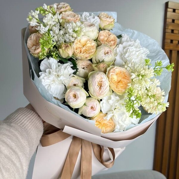 Состав: роза кустовая пиновидная, сирень, гвоздика, авторская упаковка.