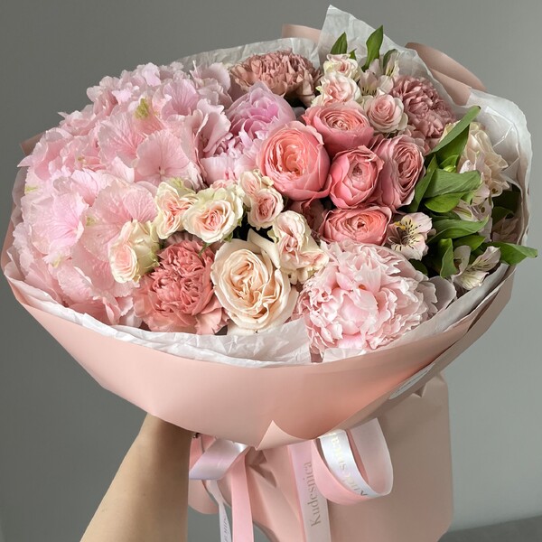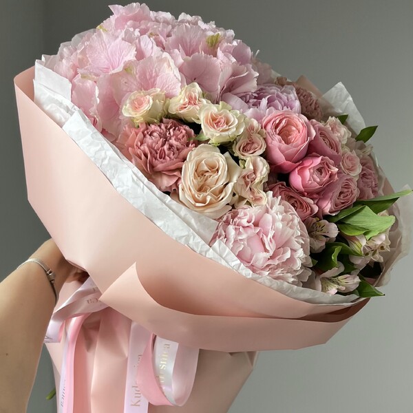 Состав: гортензия, пионовидная кустовая роза, альстромерия, гвоздика, пион, авторская упаковка.